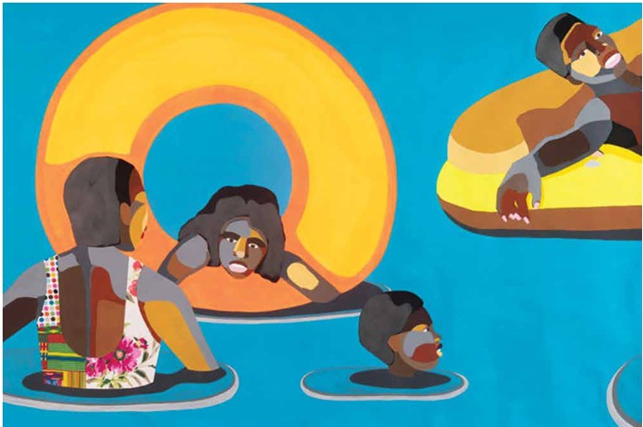 Derrick Adams’s “Floater 74,” which depicts Black people at leisure on pool floats, “claims space for community, connection, and everyday pleasures as enjoyed by Black communities” as it hints at the history of segregated swimming facilities.