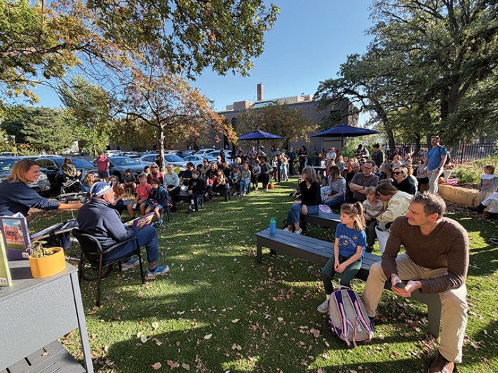 Perfectly Pointy Impossible Perpendicular Pinky.” Families gathered in the school’s new outdoor classroom, where kids and adults alike were captivated by the story — and by their distinguished neighbor. (Images: Elyse Erickson)