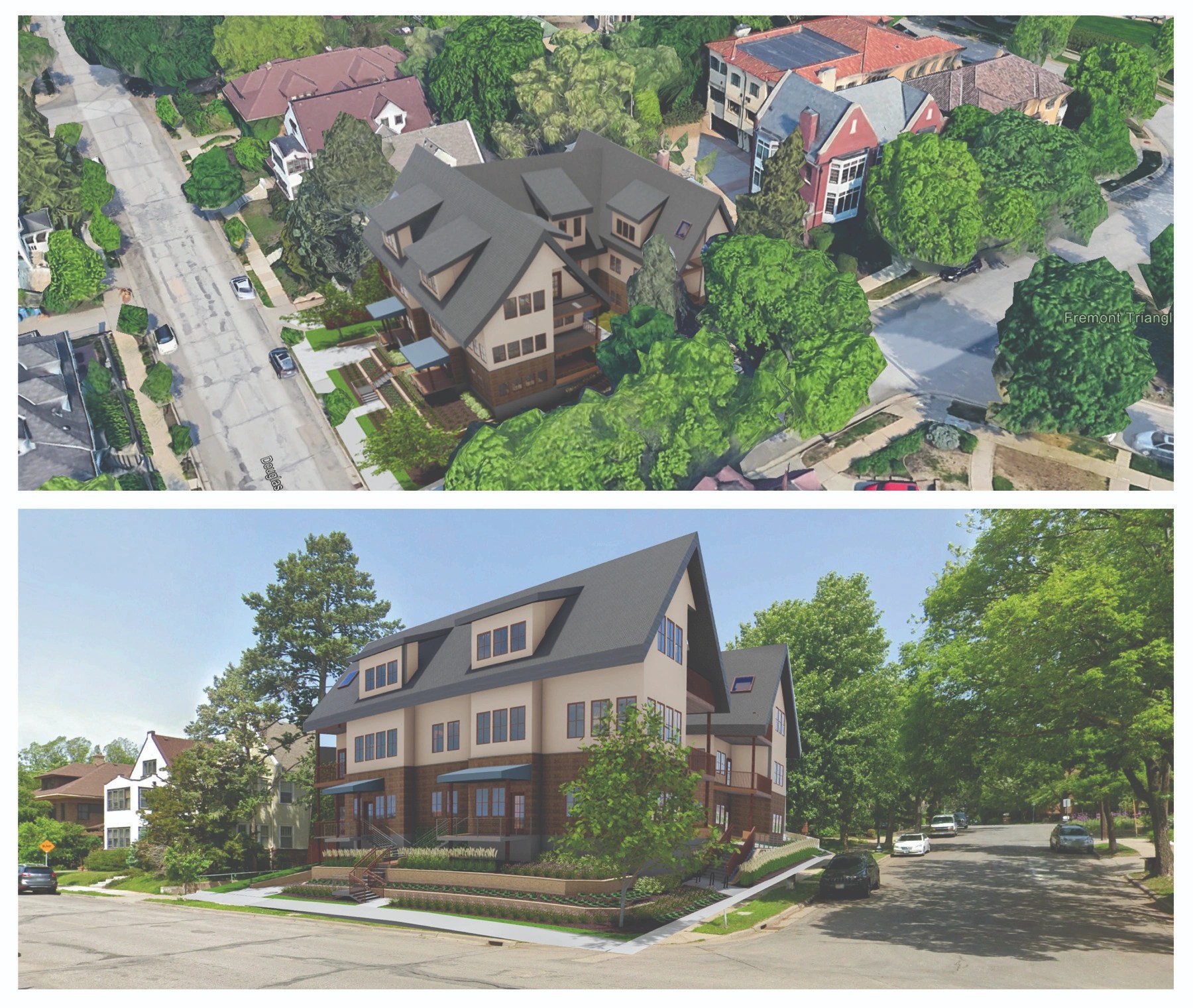 The plan spearheaded by former Lowry Hill resident Tim Baylor and his company, JADT Development Group, LLC, envisions tearing down two existing, vintage triplexes at Fremont and Douglas, combining the lots, and replacing the old structures with a building containing eight condominiums and 14 be low-grade parking spaces, with a garage door facing Douglas. An earlier version of the plan was presented to the Planning Commission Committee of the Whole on August 1, 2024, but failed to win staff support at that time because it would have required either approval of five separate variances, or up zoning the lot or the entire area from Interior 2 (IN2) to Interior 3, which permits larger and more dense developments.