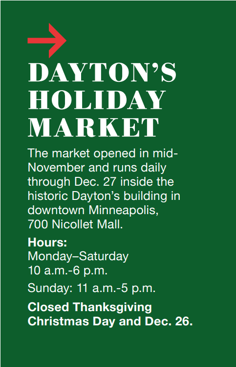 Ideas for the historic Dayton’s keep getting tossed around — an event space? A food hall? A dance club that closes at 10 p.m. so we can all get to bed on time? (OK, fine, I made that one up.) While there’s no official longterm plan, local market curator Mich Berthi- aume dreamed up a way to bring back a little of that Christmastime department store magic.