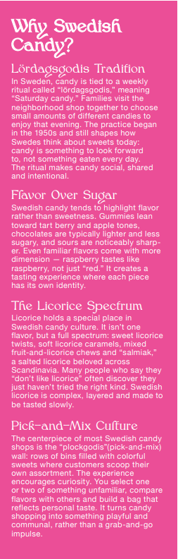 The shop will feature a Swedish-style “plockgodis,” or pick-and-mix wall, where customers can build their own assortment of candies just as they would in Sweden.