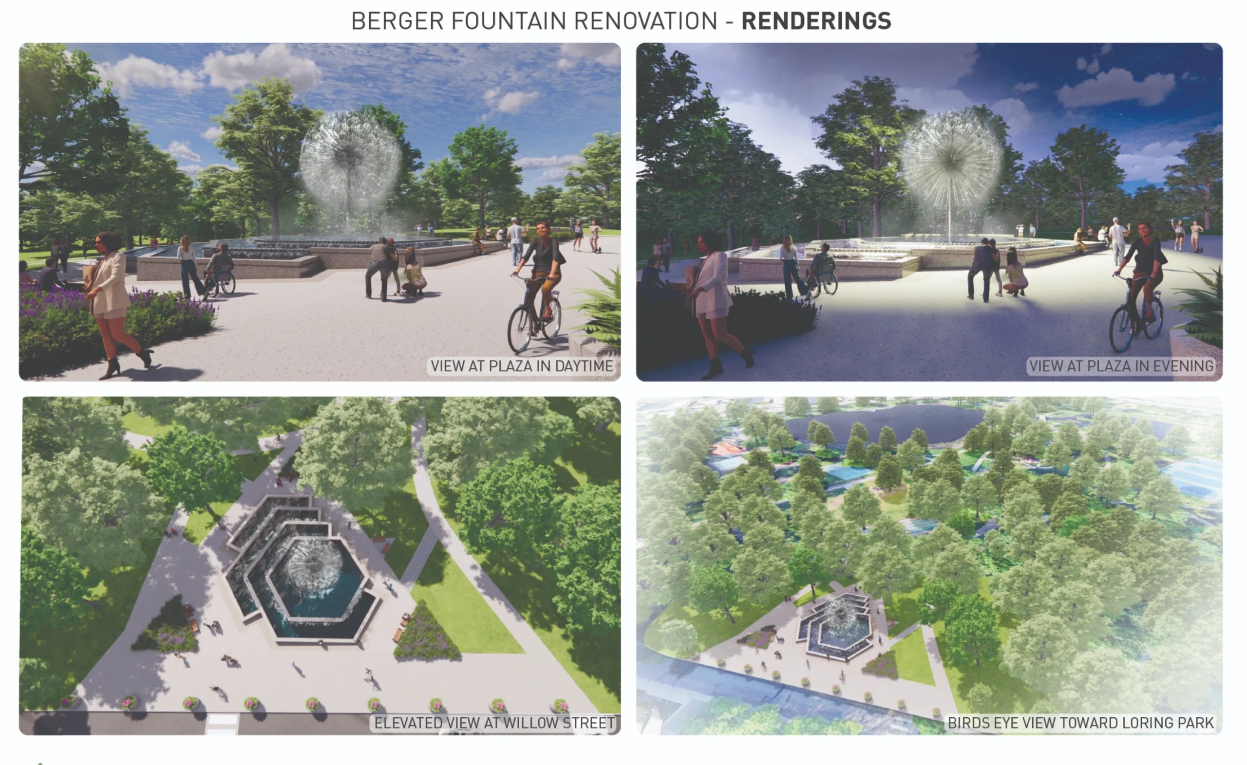 In 2021 the Berger Fountain Task Force contracted landscape architectural firm Damon-Farber to do a pre-design study to rehabilitate the fountain.