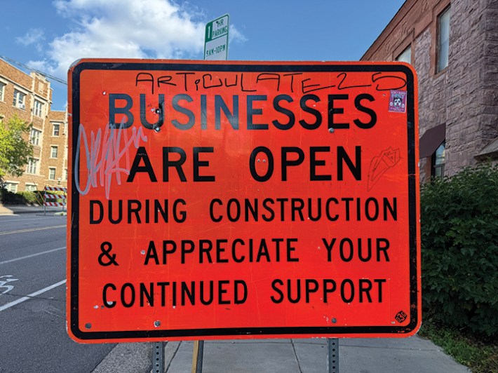 Despite the headaches of reconstruction, life carries on along Hennepin Avenue and its cross streets. At Hennepin and Franklin, neighbors still gather for ice cream at Sebastian Joe’s — even as they weave through orange signs and construction cones. (Images: Craig Wilson)