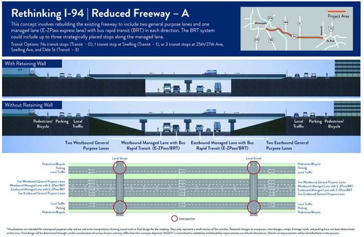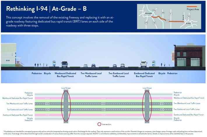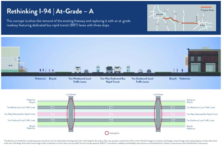 The resolutions section of the document begins by stating, “The City Council of Minneapolis continues to strongly oppose the repair or reconstruction of I-94 in its current form and rejects any roadway expansion or any right of way expansion within its boundaries.” Next up: “the City Council of Minneapolis supports a wide variety of highway removal options in the upcoming Rethinking I-94 scoping decision document, including the addition of a ‘restored network’ alternative with fewer lanes, which would maximize the potential to repurpose highway land for new public housing, affordable commercial space, parks, community gardens, or other uses determined by surrounding communities.” The council also voiced support for MnDOT to review a report conducted by the bike and pedestrian advocacy group Our Streets which, among other things, addressed “reparative highway alternatives.”
