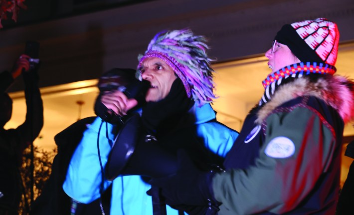 We also spoke the name of the sculpture in as many languages as possible. The vigil opened in Dakota and Anishinaabe, with call and response from the crowd. Community members spoke in Spanish, Hebrew, Arabic and several Eastern European languages.