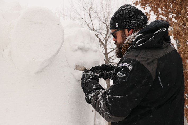 Snow was packed into large rectangular forms and the artists began to carve them into shape.