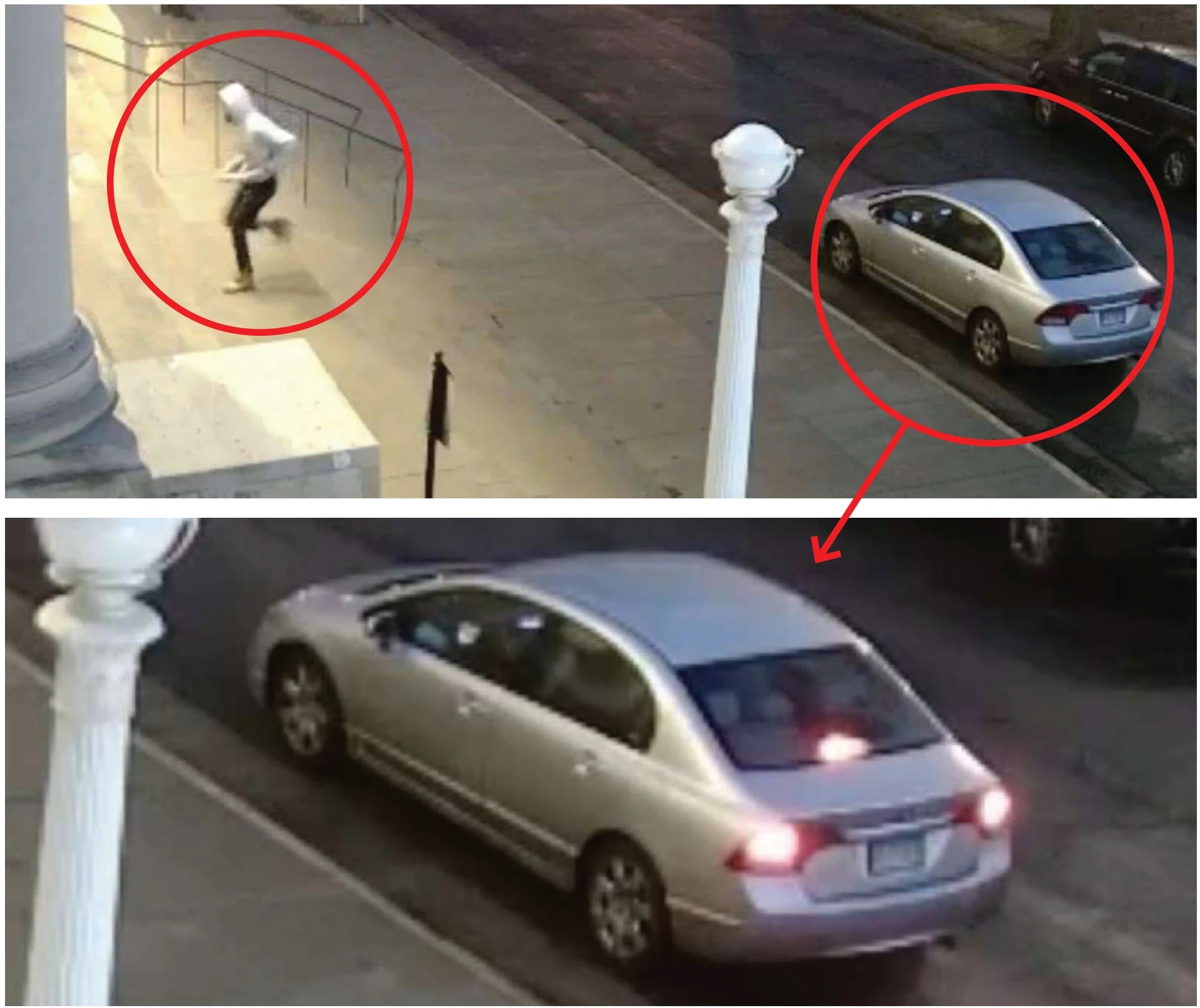 Surveillance footage shows a suspect arriving at approximately 7:19 a.m. in a silver Honda Civic.