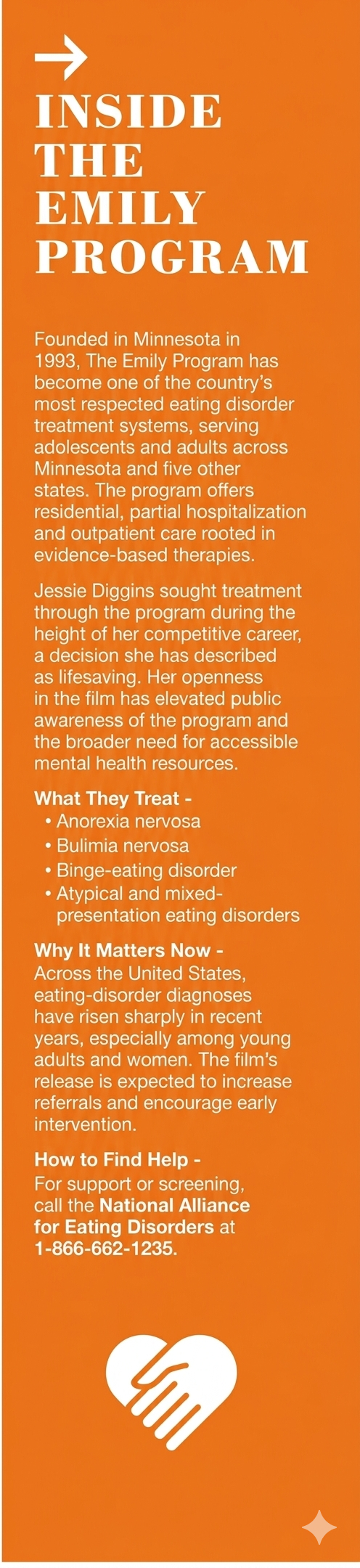 “Eating disorders have so much stigma, shame, and guilt attached to them,” Diggins said. “I hope the film sparks conversations that remove that stigma. I hope people who are struggling feel less alone and more empowered to ask for help.”