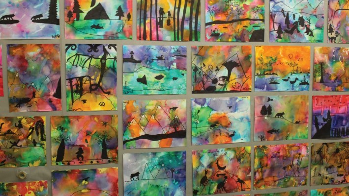 Fourth grade: Marlena Myles, Dakota, challenges the children to create meaningful images in silhouette using sharpie marker on a tissue paper background, inspired by the example of Myles’ digital designs. Myles enjoys banter with the inquisitive Kenwood Elementary children whom she recognizes as well trained by their excellent art teacher.