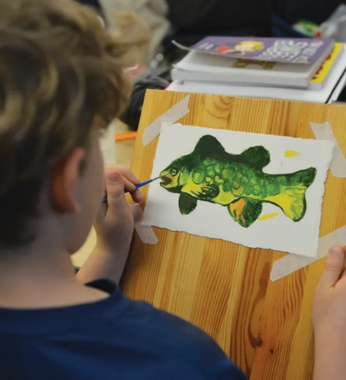 Marlena Myles inspired fourth-grade students to sketch original animal scenes, using bleeding tissue paper to add color. Fifth-grade students, guided by Angela Erdrich, sketched and painted fish that the Ojibwe catch in Red Lake, as often depicted by late artist Patrick DesJarlait (Ojibwe).