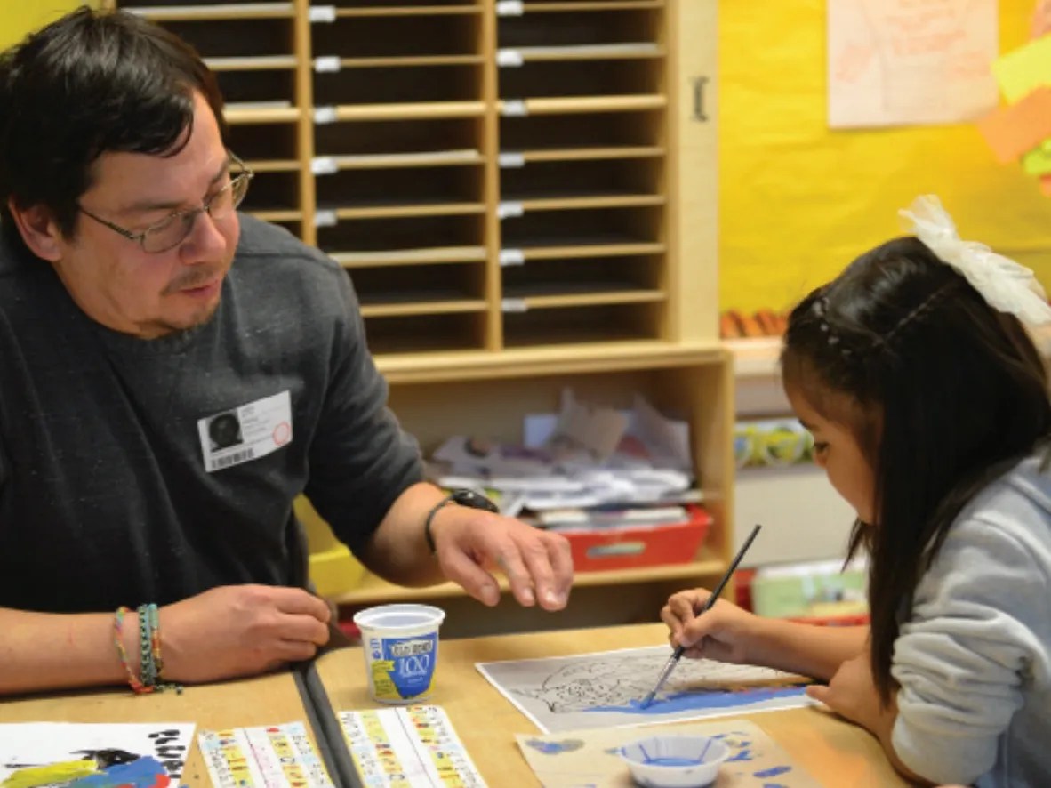 Kindergartners met with Wóokiye wiŋ (Dakhóta) to craft watercolor Dakhóta floral designs. First grade students painted colorful Ojibwe family clan designs with James Autio. Gordon Coons led second-grade students in creating large drawings with personal meaning in the Woodlands style. Hapistinna Graci Horne (Sisseton Wahpeton Dakota, Hunkpapa Lakota/Dakota) taught third-grade students how to make their own stamps, which they used to produce unique bandanna designs.