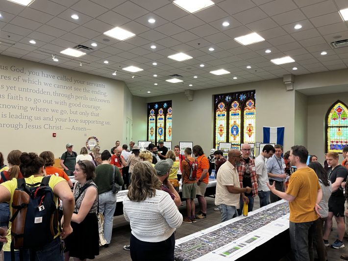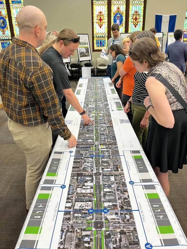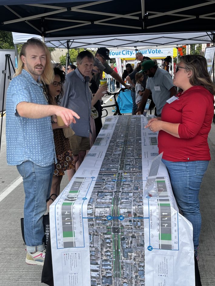One of the most disputed features is a shared-use path planned for the east side of the avenue, intended for both bicycles and pedestrians. Many cyclists favor the “orange” option, which would add a two-way bikeway from 29th Street to the north end of the corridor and remove parking on the east side to make room for a dedicated bus lane from 24th Street northward. Supporters wore orange clothing at the open house to signal their preference, though only about a quarter of attendees appeared to do so.
