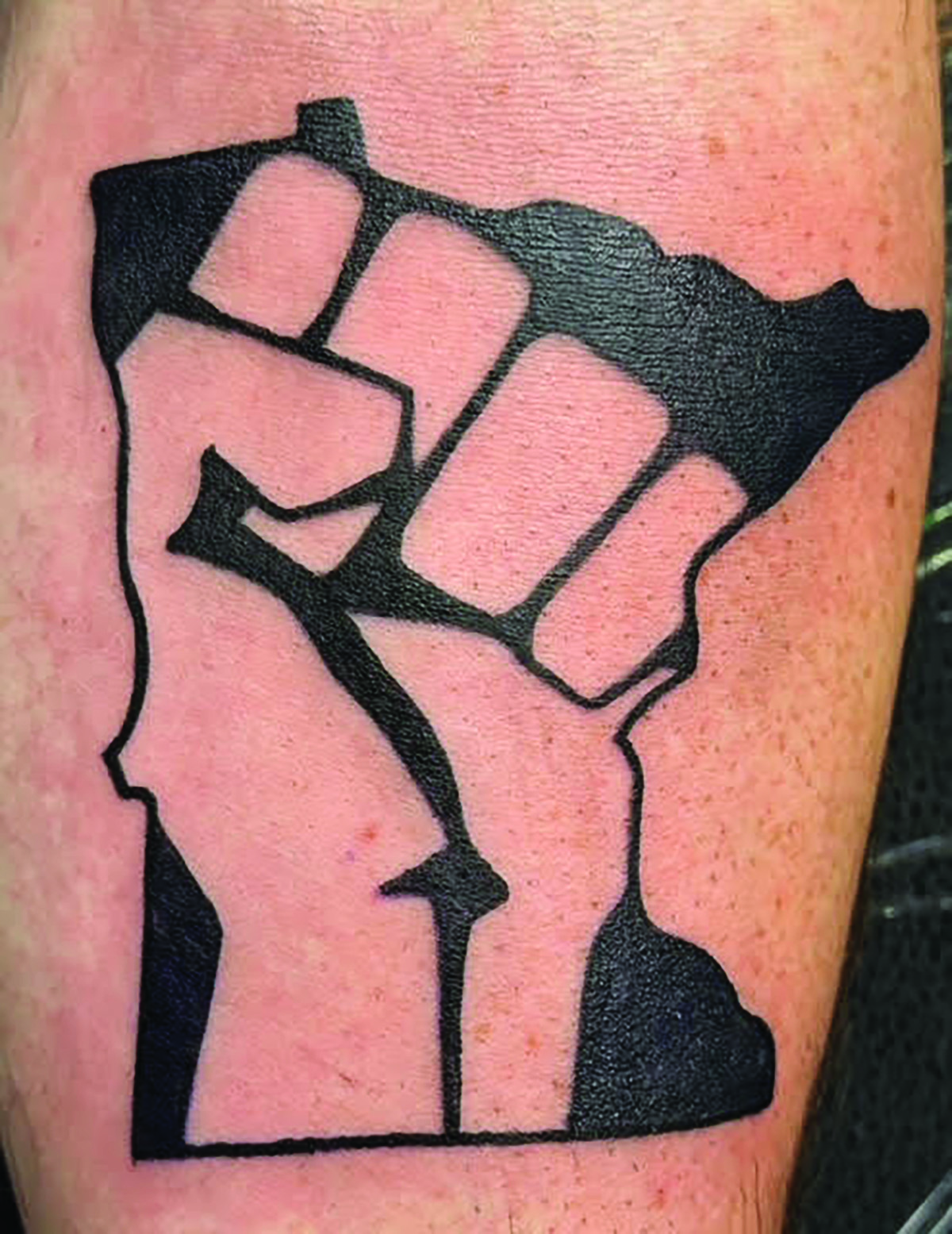 The client initially wanted a tattoo with words expressing his emotions. Endorf, recognizing that iconography can communicate more quickly than text, designed an image of a fist symbolizing resistance and solidarity, barely contained within the outline of Minnesota. The client now bears a forearm tattoo that conveys a powerful message at a glance. Endorf is relatively new to protest art but said he appreciates creating political tattoos that evoke a strong message. He is receiving more requests, as are other tattoo artists, particularly for an image inspired by the “Star Wars” Rebel Alliance symbol in which the center spire is replaced with the Minnesota loon.