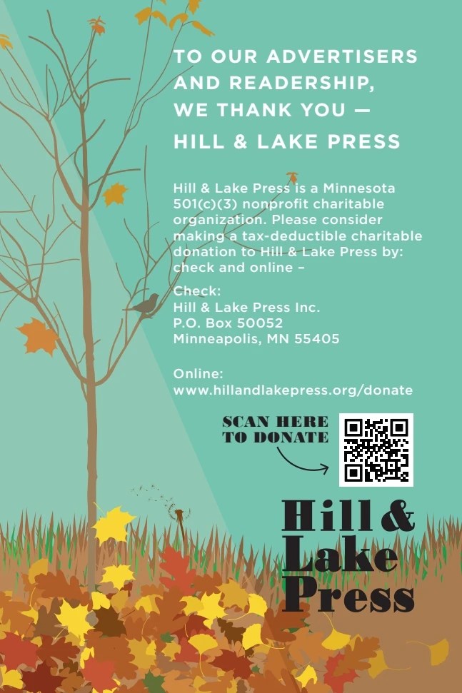 We hope you will consider making a gift of any size to Hill & Lake Press via check or credit card by following the instructions provided in the adjacent image or by visiting us at www.hilllakepress.org.