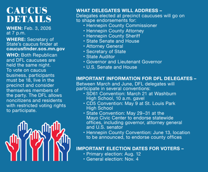 Precinct caucuses will be held Feb. 3 across Minnesota, with local democracy moving forward even as tensions persist around federal immigration enforcement.