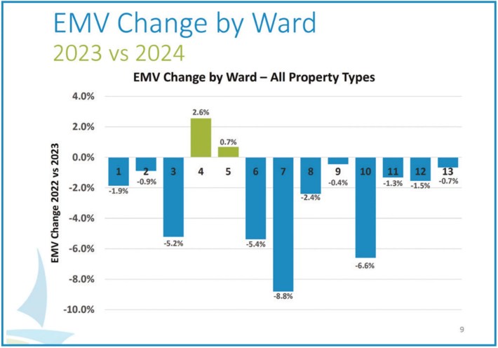 The city assessor presented 2024 total estimated property values to the City Council this month, reporting a decline of 3.1% from 2023 to 2024.