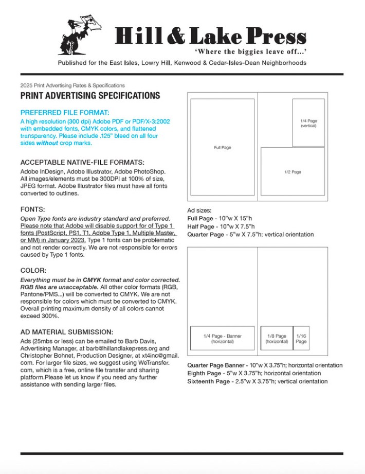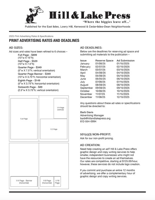 The Hill & Lake Press is published monthly with a circulation of 18,000 copies by Hill & Lake Press Inc, a Minnesota 501(c)(3) nonprofit corporation.