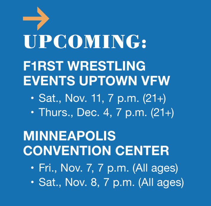In 2007, local wrestler Arik Cannon launched F1rst Wrestling, an independent professional wrestling organization. They’ve performed outside the Bryant-Lake Bowl during Pride, in the Mall of America rotunda, and at sold-out shows at First Avenue and the Uptown VFW. Their tagline? Wrestling is for Everyone. And when they say everyone, they even mean you — the deeply skeptical person still reading this article. Here’s why you should attend an upcoming F1rst Wrestling show.