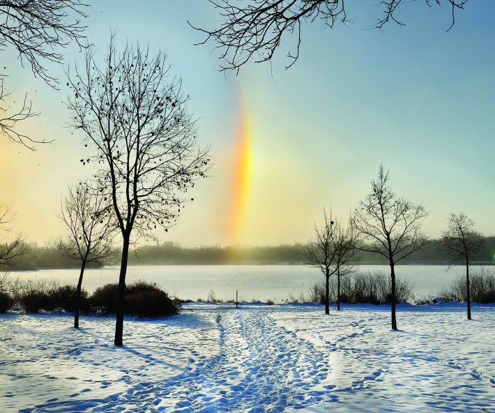 If you ventured outside during the cold morning hours of Thursday, Dec. 4, you may have been treated to another quiet aerial spectacle, courtesy of the sun. Sun dogs, also known as parhelia or mock suns, appeared on either side of the rising sun, casting rainbow arcs above and below it and, when conditions are strong enough, forming a white halo known as a parhelic circle.