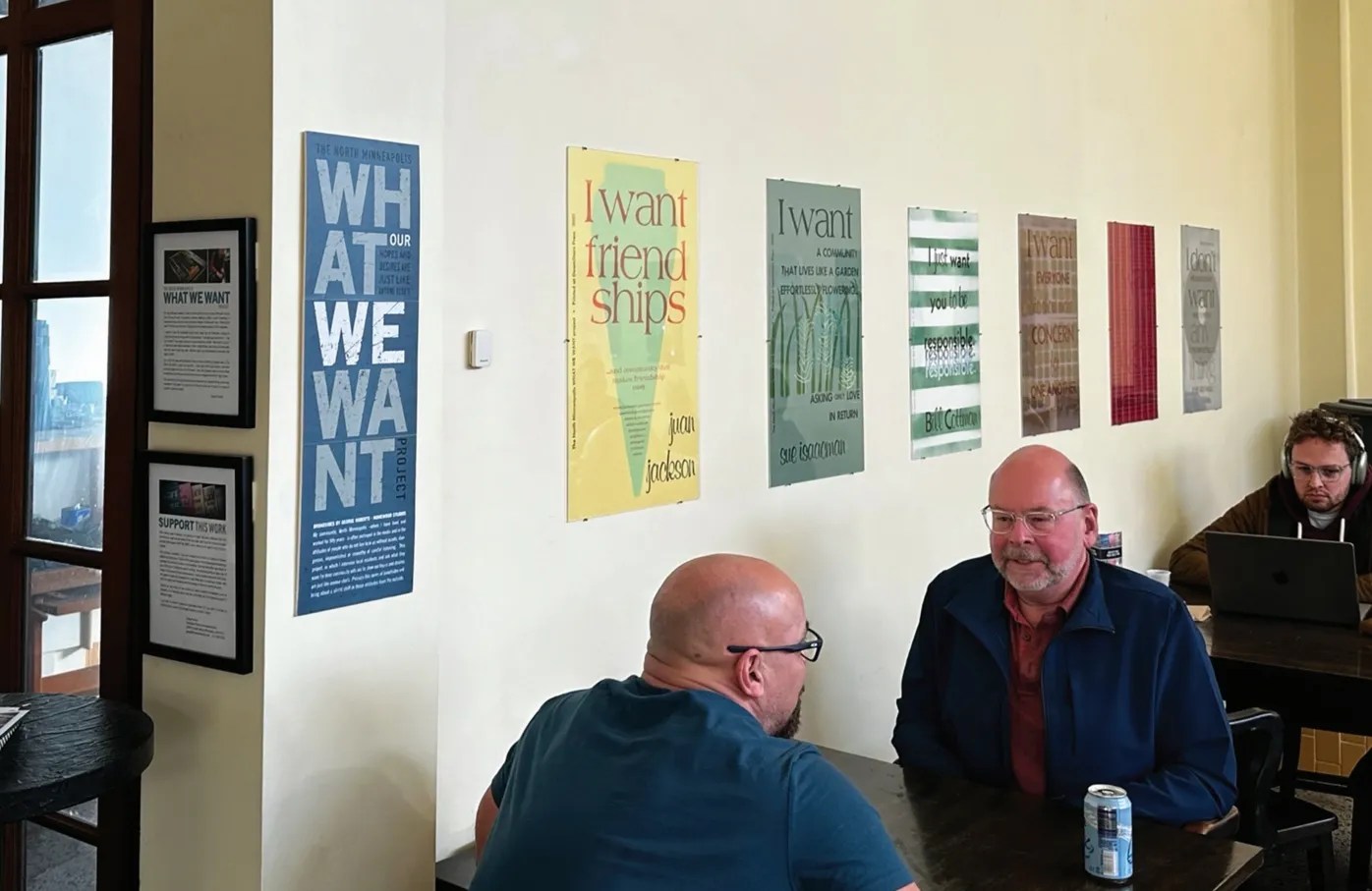 The exhibit is titled, “The North Minneapolis What We Want Project.” It emerged from George’s interviews with local residents, in which he asks what they want for their community. He places a bench outside of his studio on Plymouth Avenue, where he sits and waits until inevitably, someone stops and talks with him. At some point in the conversation, George asks, “what do you want?” and then proceeds to design and print a broadside poster of their response.
