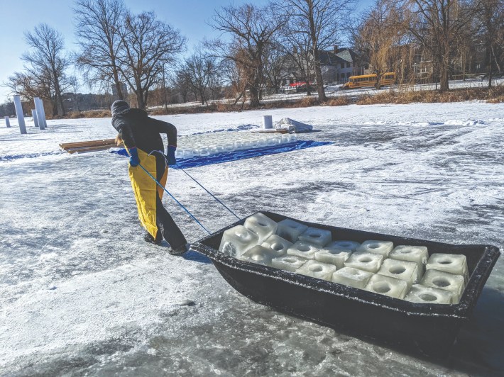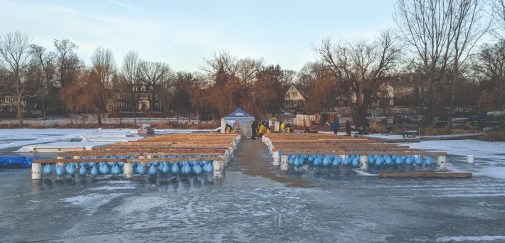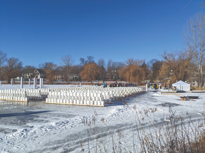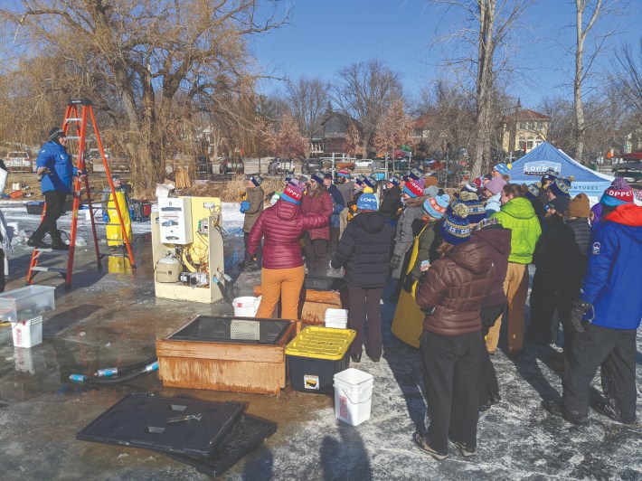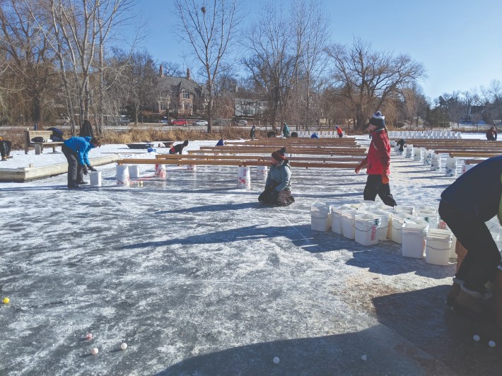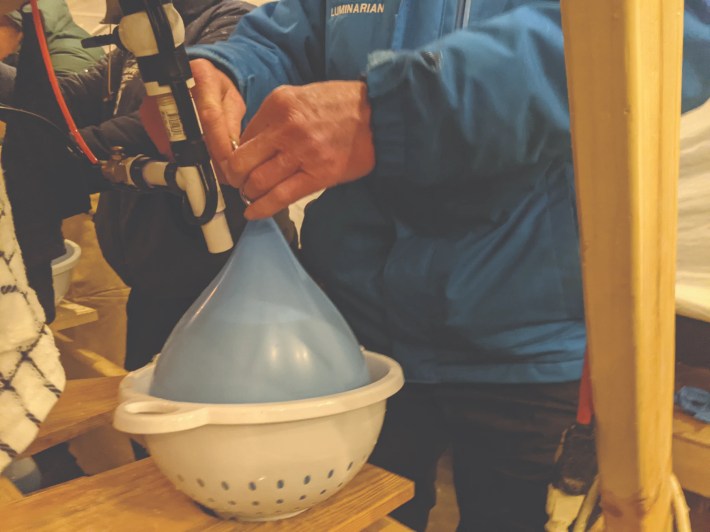 All of this depends on an army of volunteers. The Luminary Loppet is the brainchild of several Hill & Lake neighbors who over the years have developed Rube Goldberg contraptions to fill those 1,400 luminary buckets and 800 teardrop balloons efficiently, and figured out the science of freezing water so that all the forms remain hollow in the inside for candles.