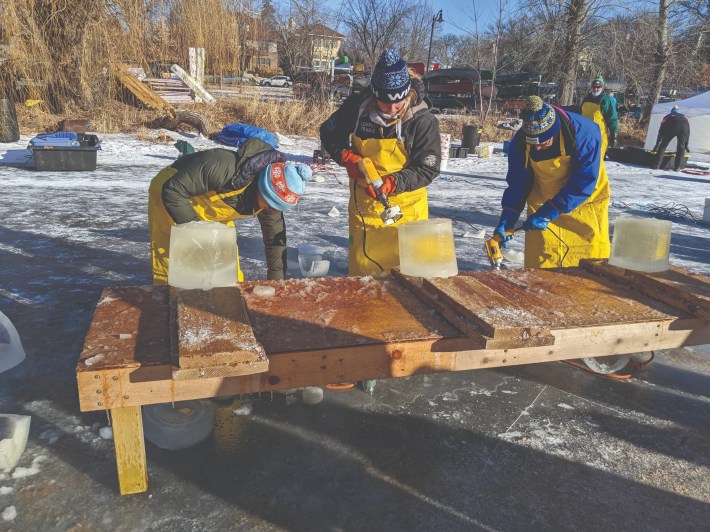 These are photos of the hardy volunteers who turn out weeks in advance to help make it all happen. From those who build and fill the large forms, to the bucket and balloon brigades who assemble at dark and make short work of their icy task, it’s community at its best. The camaraderie and creativity of the whole operation warms the heart, even as the fingertips freeze.