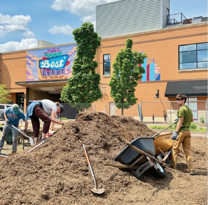 Led by long-time East Isles resident Dan Sutton, volunteers with wheelbarrows and power tools in hand cleared the empty lot on Lake Street behind Seven corners.