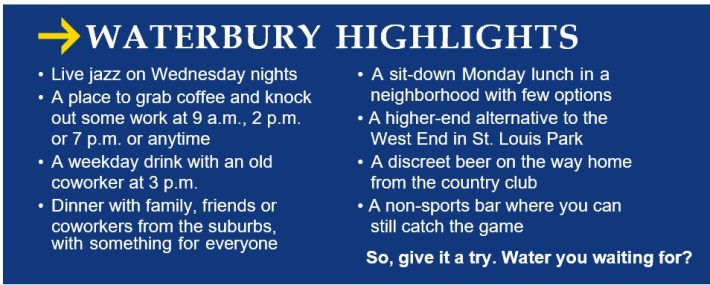 If you haven’t heard of Waterbury, you’re not alone. It’s the restaurant inside the Waterbury House apartment building — the high-end luxury complex wedged in that odd triangle near the fire station, Whole Foods and Bde Maka Ska. Like everything else in that corner of the city, it’s surrounded by construction. The building and restaurant share almost the same name, which makes it even easier to miss. But it’s there. Let’s talk about it.