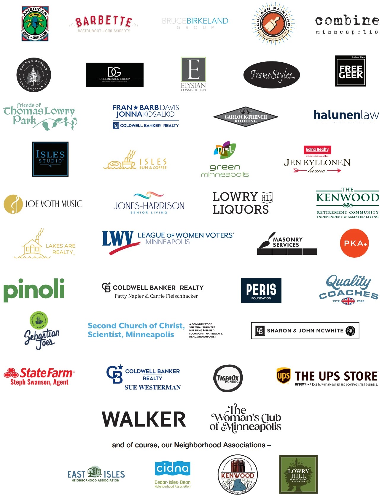And the following business and organizations: BergLarsen Group, Birchbark Books, Celia DeLago, Chad Harken - The Brokerage Real Estate Co., Coldwell Banker Reality - The Minneapolis Lakes Office, Doors Open Minneapolis, Groveland Gallery, Kenwood Guest House, Kenwood Isles Condominiums, LOTI Pencil, MADE IN MINNESOTA - Spirits Tasting Event, Psychedelic Healing Collaborative, Saint Paul's Church on Lake of the Isles, Trapeze - Bubbles & Toasts, and the Uptown Art Fair. Our profound apologies if we have inadvertently missed any of our loyal advertisers.