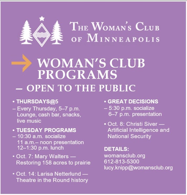 “ Thanks to a dedicated board and determined membership, the Club’s educational programs have resumed, along with the social and musical events held in the classic lounge overlooking Loring Park. For now…”